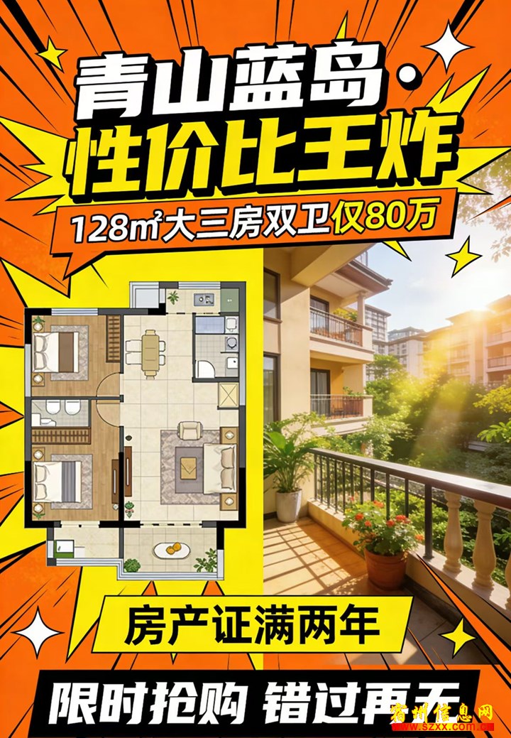 青山蓝岛·捡漏王炸房|性价比直接炸穿天花板128㎡大三房双卫|仅80万可谈