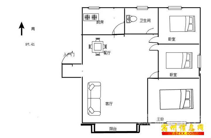 - 南北通透95.2㎡,3室1厅1卫1阳台全
