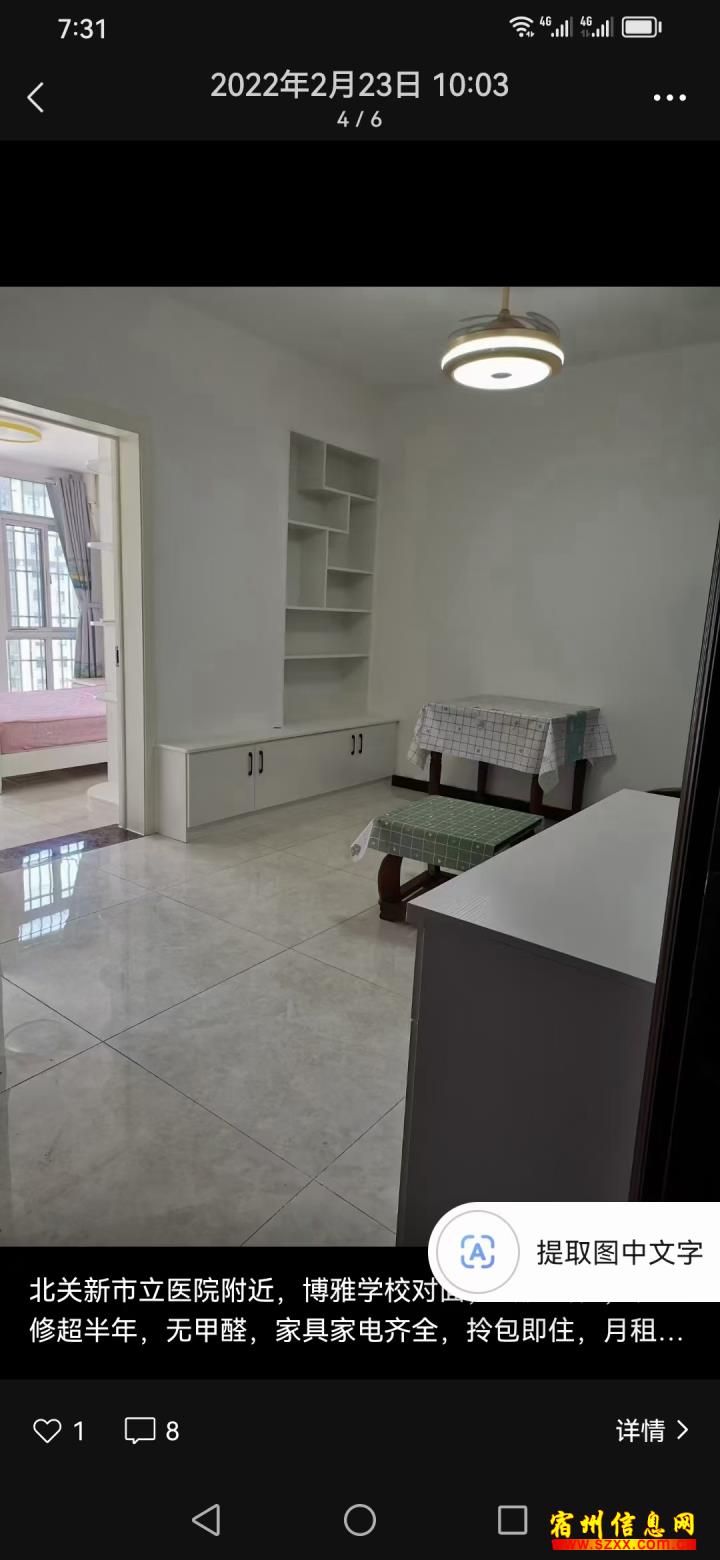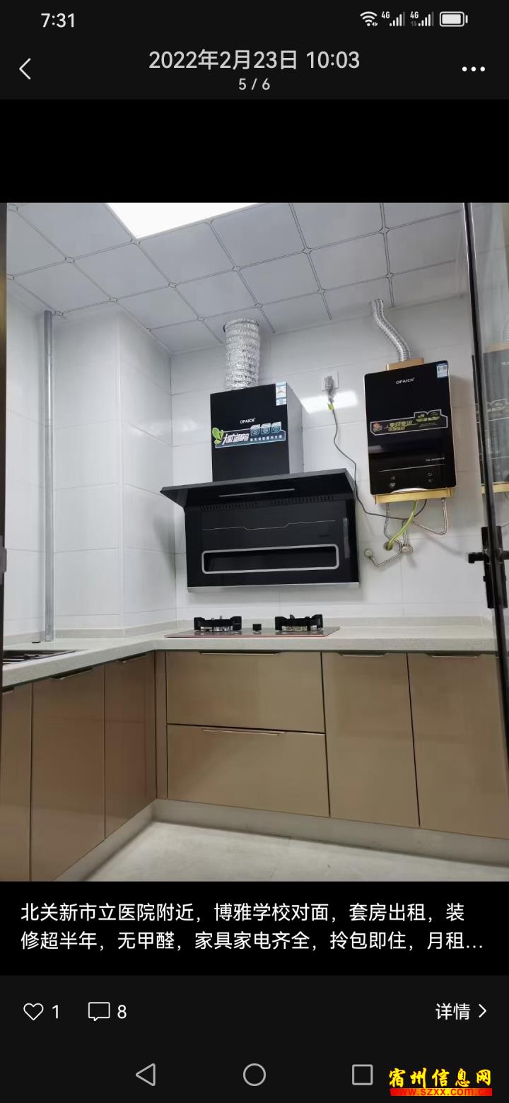 北关新市立医院附近,博雅学校正对面城镇一体化小区套房出租,面积65平,两室一厅,空调,冰箱,全自动洗衣机,燃气热水器,浴霸,一应俱全,拎包即住,月租800,交三押一,包物业,来电话时请说是在宿州生活网www.suzhouba.cn看到的!