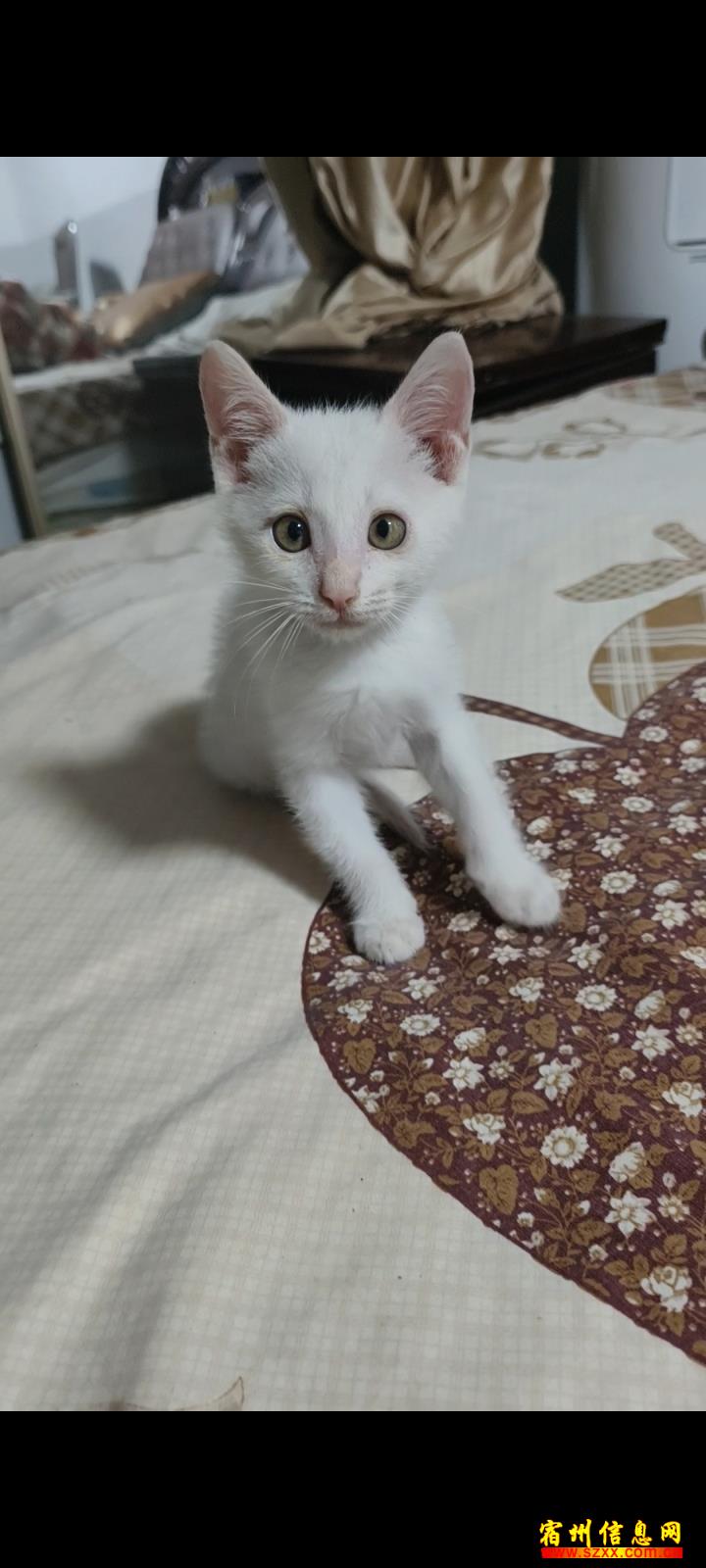 猫咪一个半月左右,纯白色的小弟弟一只,找爱猫家庭免费领养。可加微信(说明来意)来电话时请说是在宿州生活网www.suzhouba.cn看到的!