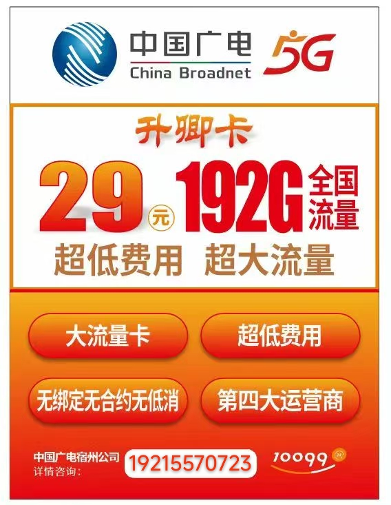 升卿卡每月192升卿卡每G全国通用流量,G全国通29元,首月按天29元,计费,无合约,当计费,无月流量用不完可结月流量用转,打电话一毛五转,打电一分钟,接听免费一分钟,长期套餐,官方,长期套工作人员上门办理。来电话时请说是在宿州生活网www.suzhouba.cn看到的!