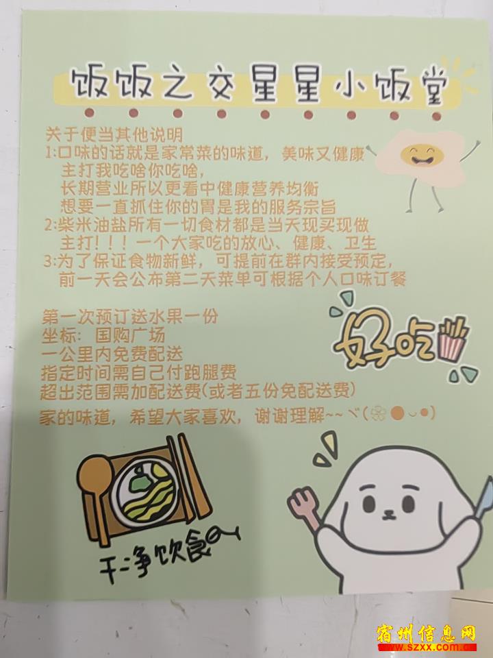 本饭堂针对写字楼医院学校,服装店,奶茶店等订餐服务,每天菜品更新,用最新鲜的食材,最健康的食材,价格适中,位置,国购广场,1公里内免费送餐,超过1公里5分起订,欢迎咨询来电话时请说是在宿州生活网www.suzhouba.cn看到的!