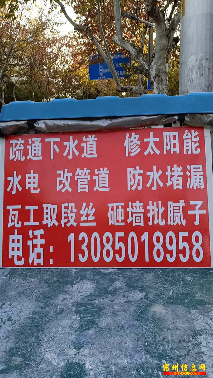 专业疏通各类下水管道,马桶,地漏,水电安装,电路漏电,改管道,修太阳能,换龙头灯具,防水堵漏,瓦工,打门砸墙,拆除,批腻子,木工隔段来电话时请说是在宿州生活网www.suzhouba.cn看到的!