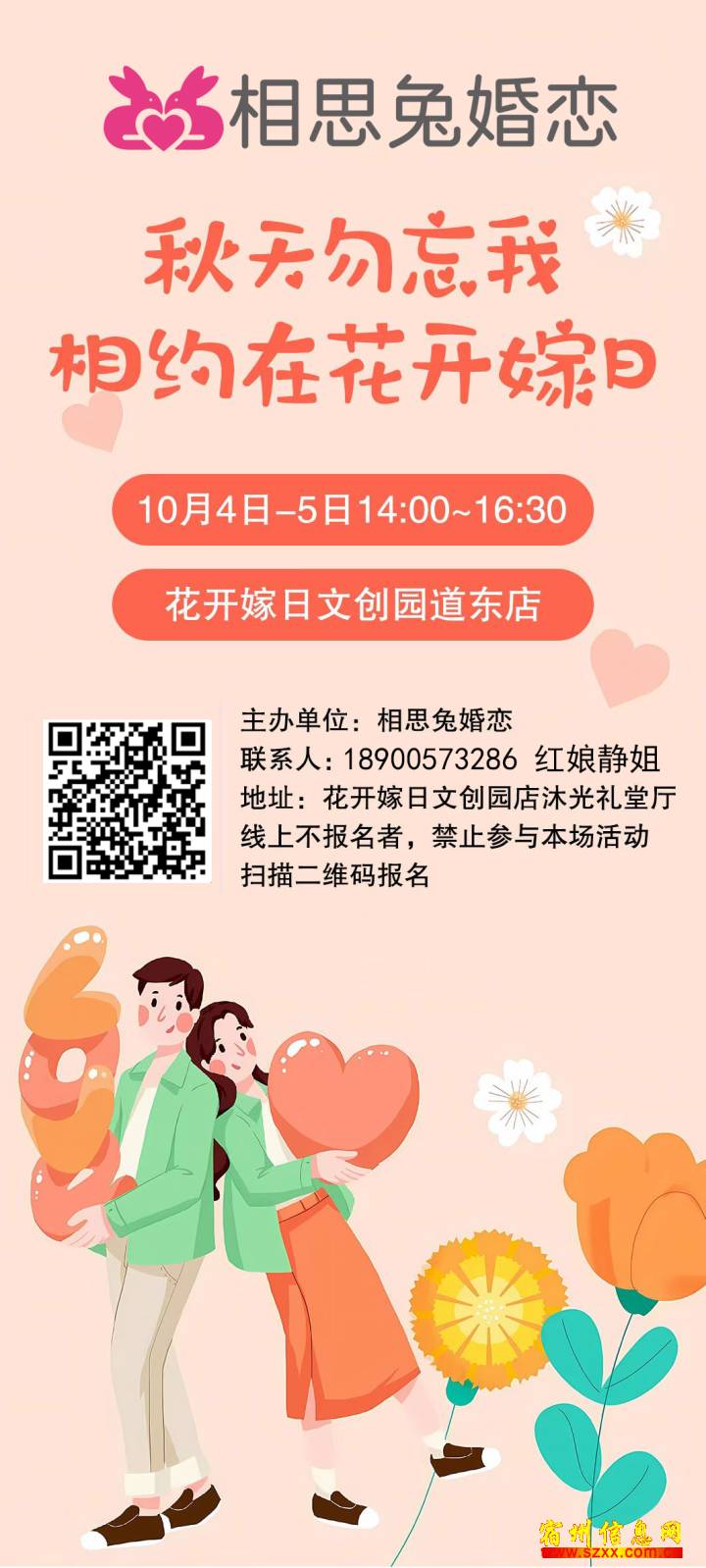 重要提醒:相亲会现场不接受报名,需提前通过红娘完成线上报名。来电话时请说是在宿州生活网www.suzhouba.cn看到的!