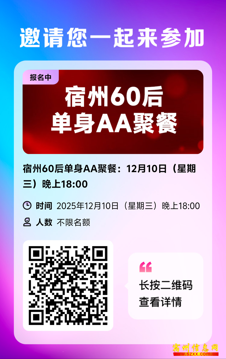 2、宿州70后单身AA聚餐:12月11日(星期四)晚上18:00