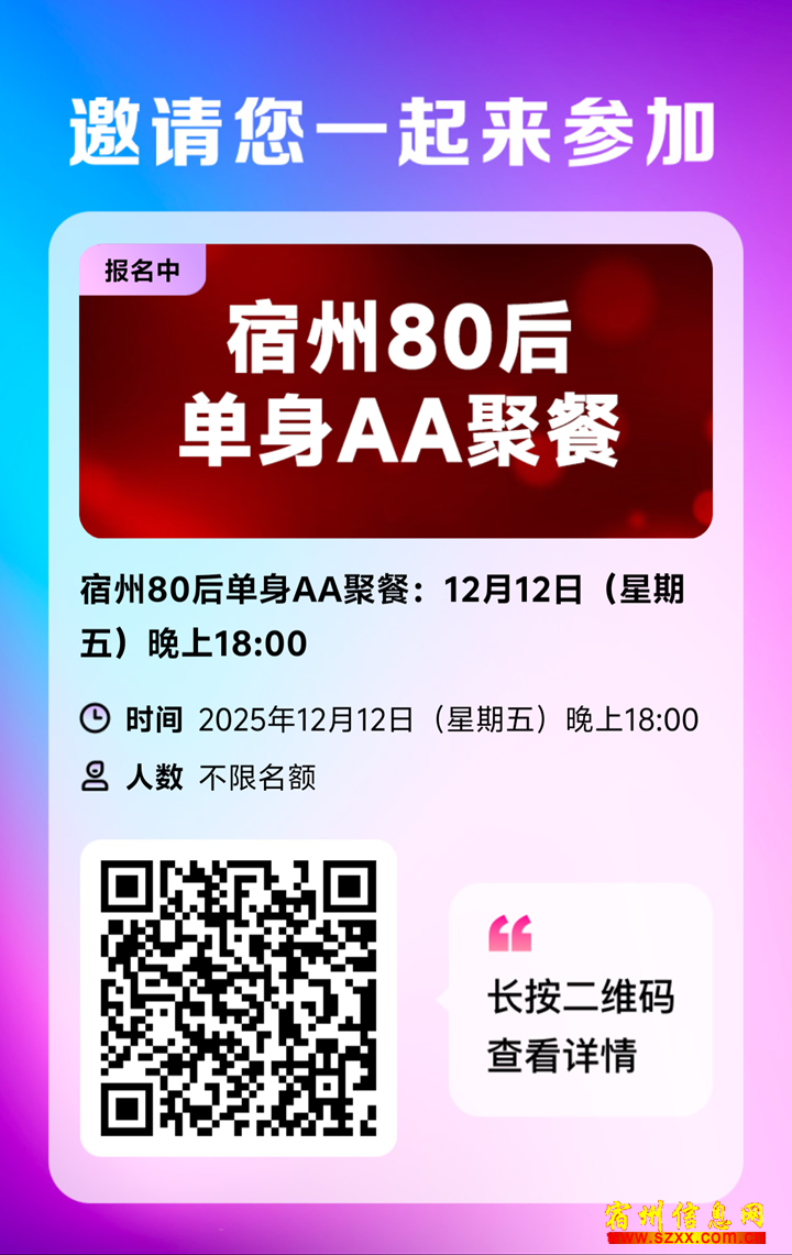 3、宿州80后单身AA聚餐:12月12日(星期五)晚上18:00