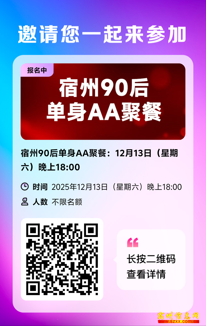 4、宿州90后单身AA聚餐:12月13日(星期六)晚上18:00