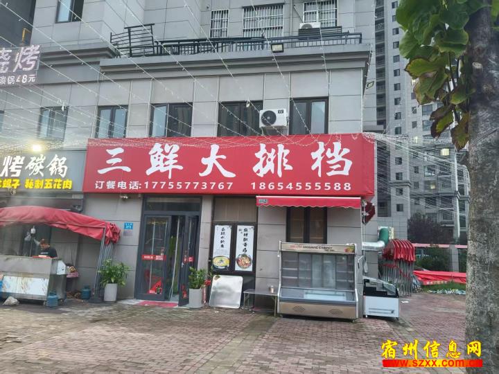 三鲜大排档门店转让。门店位置好,西边空地都可使用。设备齐全,接手就可以开干。有意者联系。来电话时请说是在宿州生活网www.suzhouba.cn看到的!