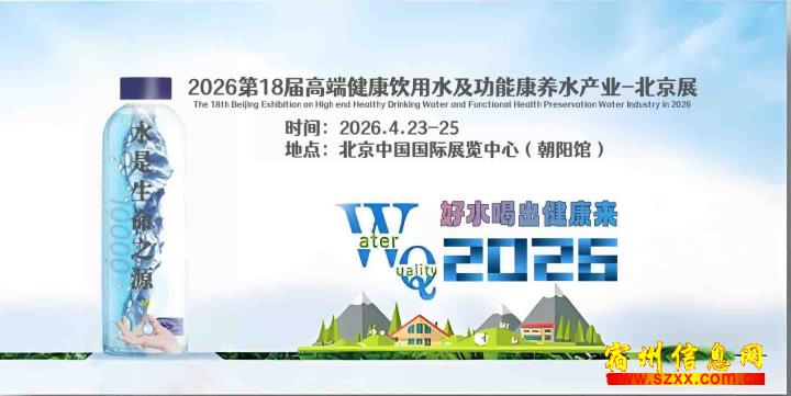 2026 年 4 月 23 日 - 25 日,北京・中国国际展览中心(朝阳馆),诚邀国内外高端饮用水企业、专业采购商、行业**共赴这场开年健康饮水盛会,携手链接全球资源,共同开启高端健康饮用水产业新征程!来电话时请说是在宿州生活网www.suzhouba.cn看到的!