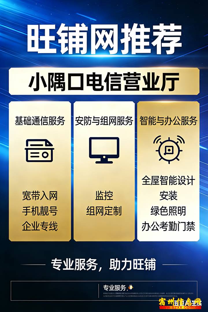 业务范围:宽带入网,手机靓号,企业专线、监控、组网定制、全屋智能设计及安装、绿色照明,办公考勤、门禁等来电话时请说是在宿州生活网www.suzhouba.cn看到的!
