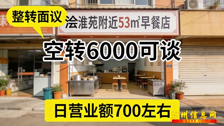 浍淮苑附近53平方早点店,可整转可空转,整转接手就干,空转价格较低,目前日营业额700左右,有兴趣的朋友可以实地考察或者电话联系!来电话时请说是在宿州生活网www.suzhouba.cn看到的!