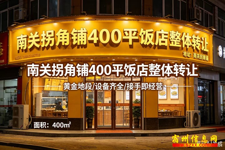 南关路口拐角铺4南关路口00平饭店,租金00平饭8万一年,整转接8万一年手就干,十几年老手就干,店生意稳定,总共店生意稳6个包厢,双门头6个包厢十几米宽,附近人十几米宽流量大,有兴趣的流量大,朋友可以实地考察或者电话联系!来电话时请说是在宿州生活网www.suzhouba.cn看到的!