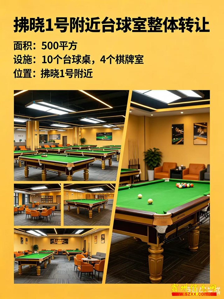 拂晓壹号附近50拂晓壹号0平台球室,一年0平台球房租10万多,内房租10有台球桌10个,有台球桌棋牌室4个,每日棋牌室4流水1500左右流水15,店铺全新装修设,店铺全备齐全,接手就干备齐全,!(流水可查),!(流水有兴趣的朋友可以有兴趣的实地考察或者电话联系!来电话时请说是在宿州生活网www.suzhouba.cn看到的!